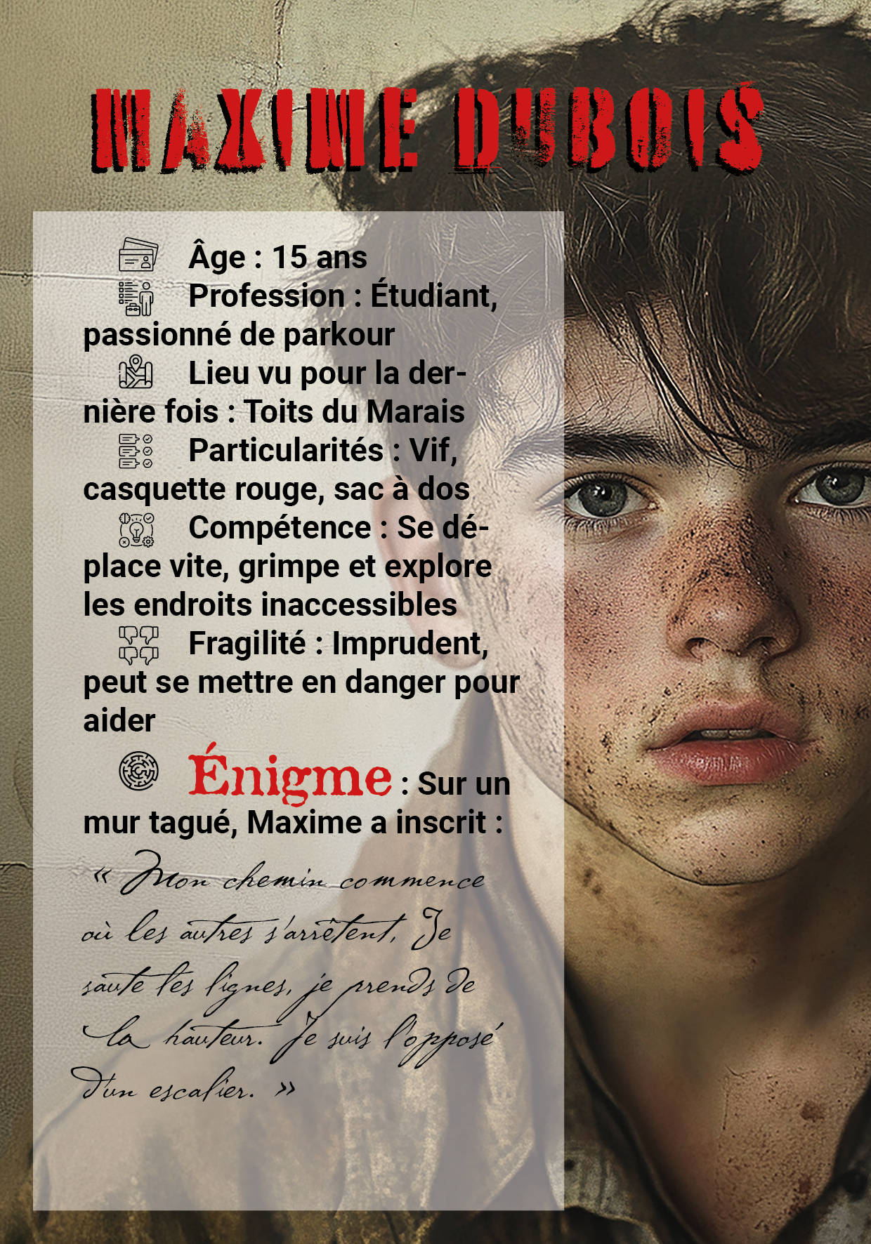 Réalisation d’un kit de supports graphiques pour un jeu d’escape game à domicile, comprenant une pochette cartonnée à rabats, un plan annoté de Paris et deux fiches personnages. L’univers visuel doit évoquer une ambiance mystérieuse et immersive, tout en assurant la lisibilité et la cohérence graphique entre les différents éléments. Le livrable doit répondre aux contraintes techniques spécifiées dans le cahier des charges.